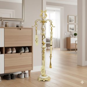 این ست پاشنهکش برنزی با هدف ترکیب کاربردی بودن و زیبایی طراحی شده است. پاشنهکش با ساختار محکمش به آسانی در دسترس بوده و برسهای همراه با الیاف مرغوب، پاکیزگی و نگهداری صحیح کفشها و البسه را تضمین میکنند. پایهٔ سنگی تعادل و پایداری بالایی فراهم میسازد و فریم برنزی هماهنگ با آبکاری طلایی، جلوهای لوکس به فضای ورودی یا کنسول شما میبخشد.