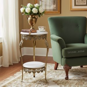 این میز مناسب استفاده در دکوراسیونهای کلاسیک، کنار مبلمان و فضاهای لوکس است. ترکیب رنگ برنز با سنگ مرمر، حس اصالت و شکوه را به محیط میافزاید.